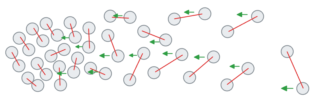 Two objects connected by a spring will attempt to maintain a specific distance (x above). If the objects are further than x, they exert an attractive force toward each other. If the objects are closer than x, they exert a repellant force.